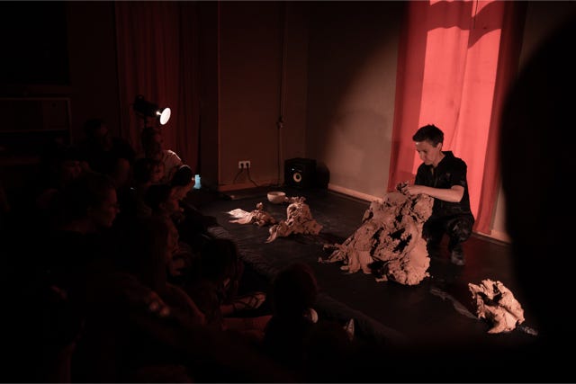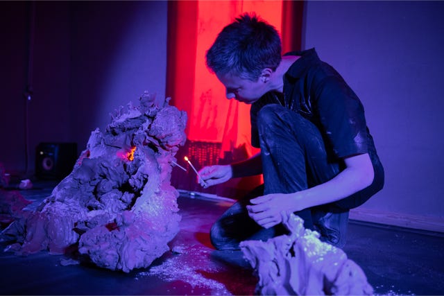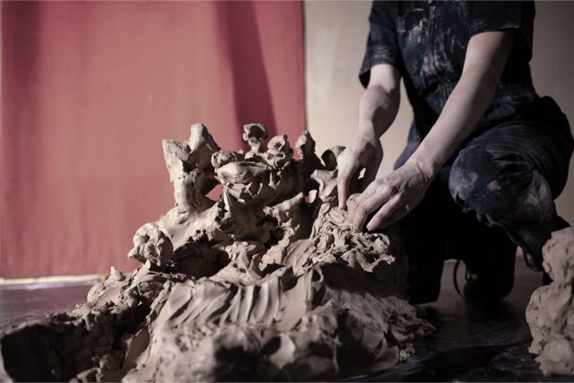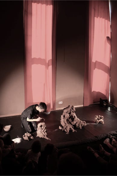 Une masse d'argile qui se métamorphose aux sons vaporeux d'une guitare électrique. Une expérience visuelle et sonore contemplative.